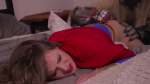Scarecrow knocks Suprema out and places her on his bed. Groping her body. Exposing her breasts for his enjoyment. Forcing her to drink more of the drugged water. With very little resistance, he is able to take advantage of her in anyway that he desires.